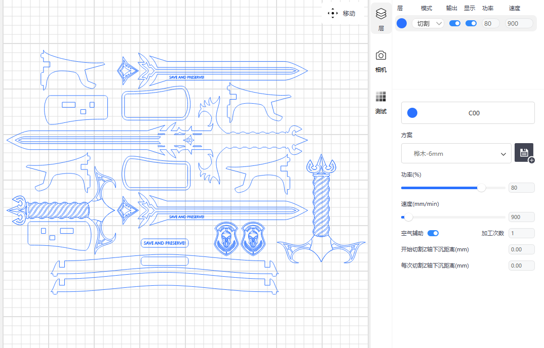 步骤2:选择不同图层,设置进行切割的加工参数。